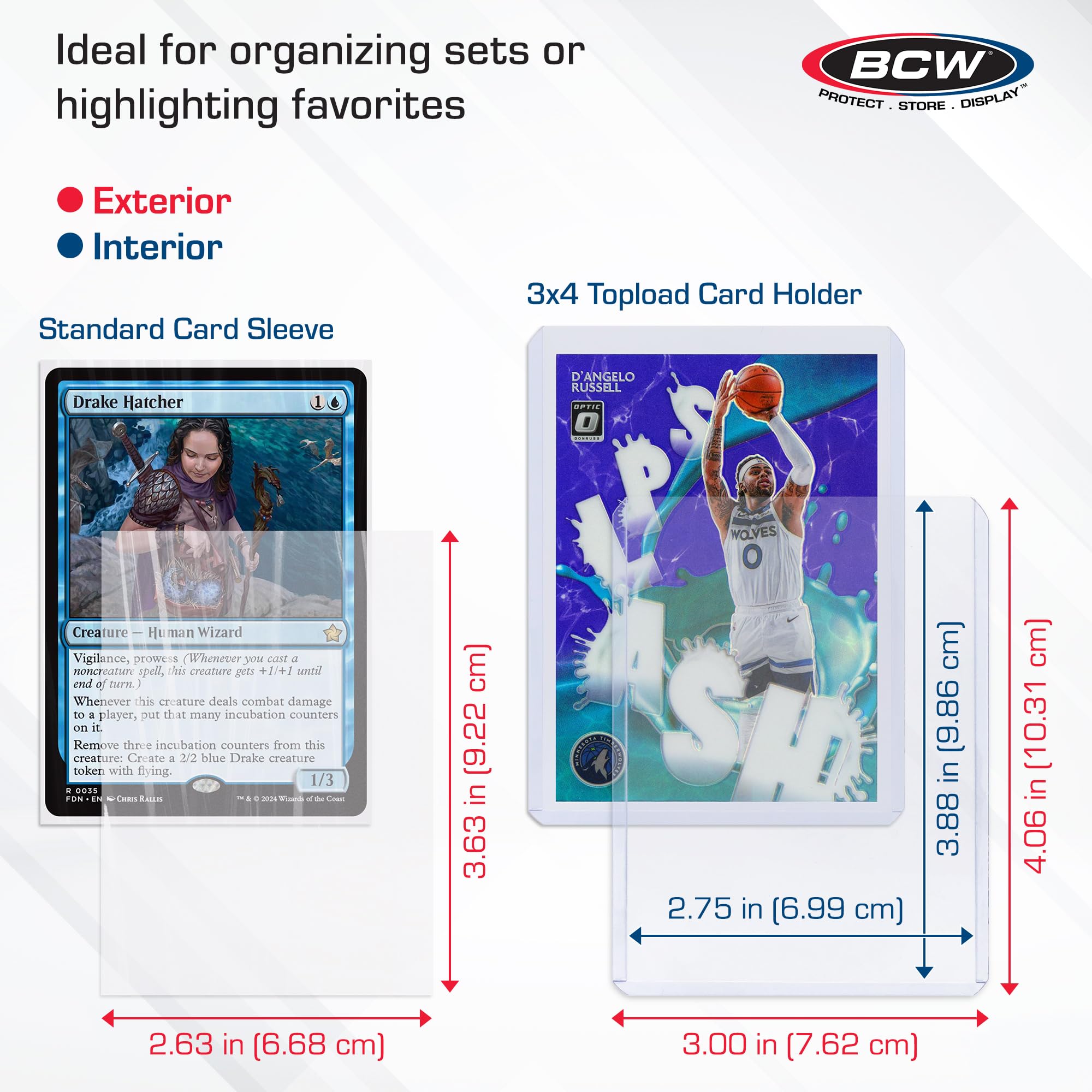- Durable Construction: These BCW top loaders for cards, also known as hard card sleeves, are meticulously crafted from high-quality, rigid PVC, renowned for its durability in the competitive collectible trading card industry, providing effective protection against wear and tear over time.