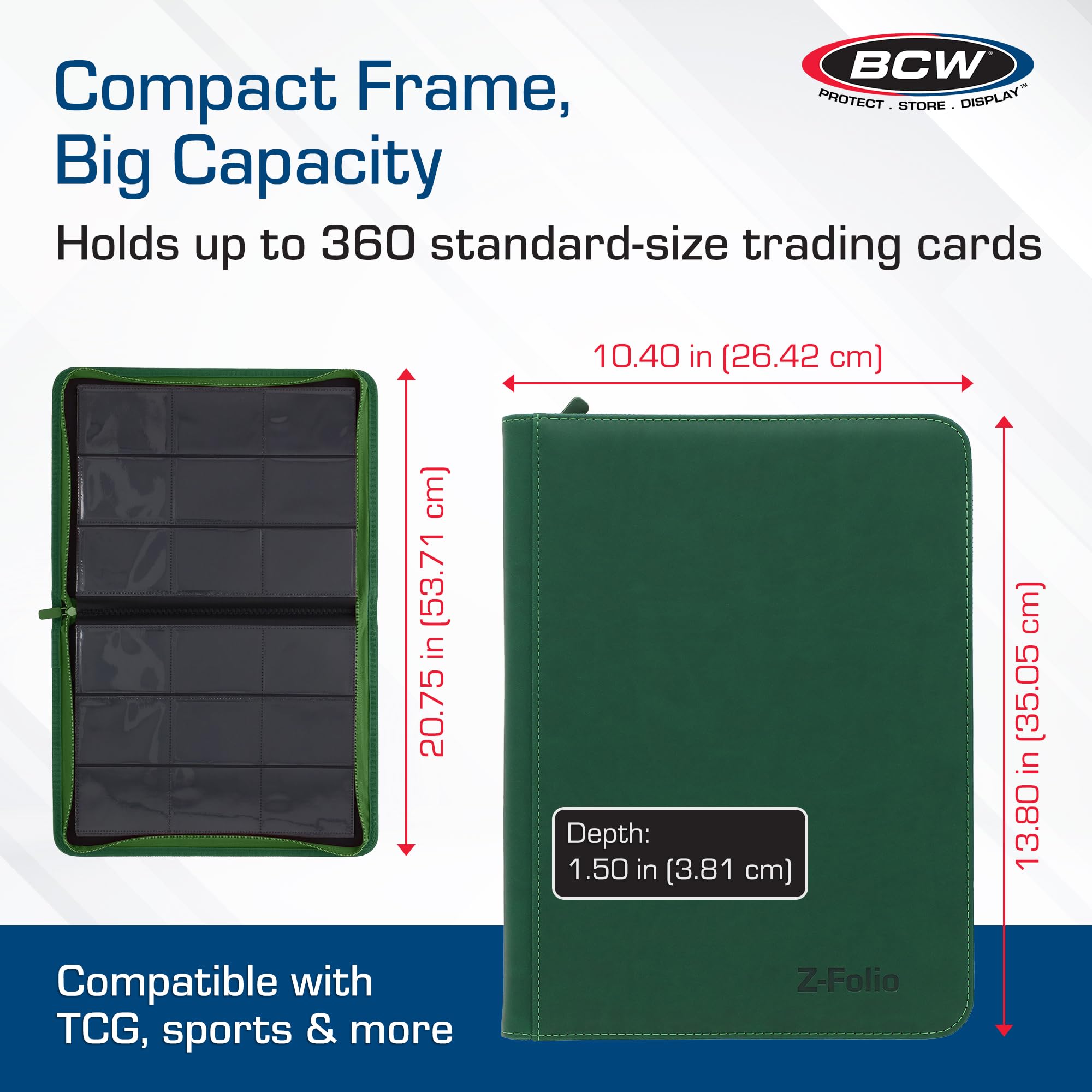 BCW Z-Folio 9-Pocket LX Album - Green | Secure Zipper Card Organizer | Premium Leatherette Card Collection Binder | Trading Card Binder for Pokemon, MTG, Sport Cards and More—
