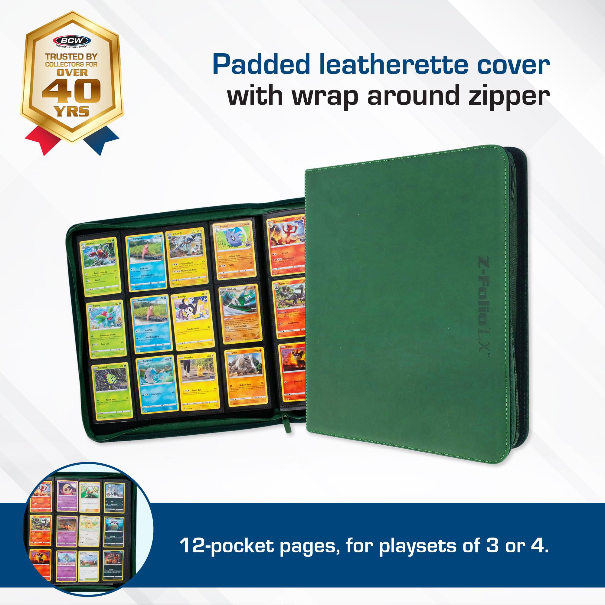 BCW Z-Folio LX Zipper Portfolio - Premium Green Leatherette 12-Pocket Playset Album - Secure Zipper - 480 Card Capacity - Card Collector's Dream - Card Organizer - Trading Card Storage
