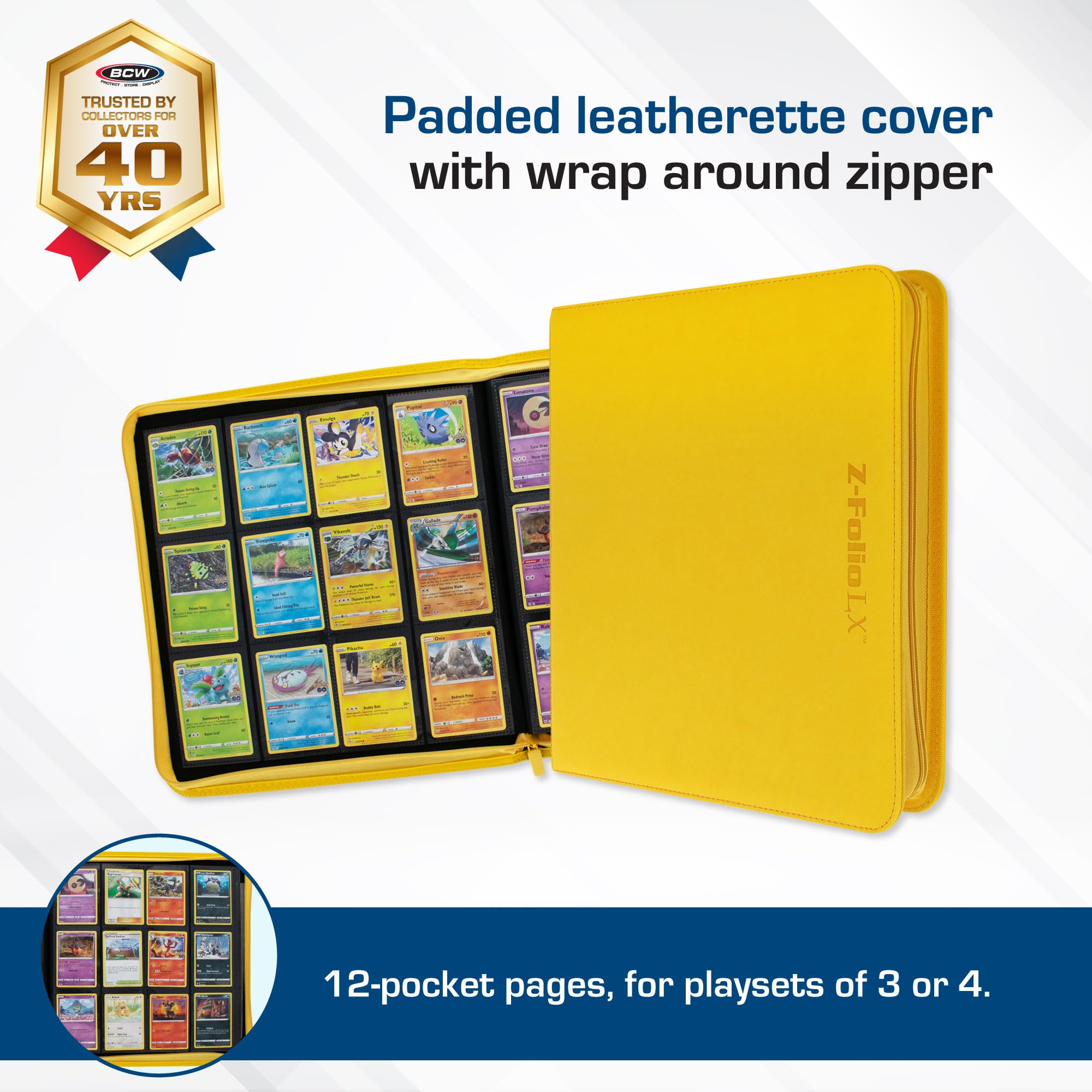 BCW Z-Folio LX Zipper Portfolio - Premium Yellow Leatherette 12-Pocket Playset Album - Secure Zipper - 480 Card Capacity - Card Collector's Dream - Card Organizer - Trading Card Storage